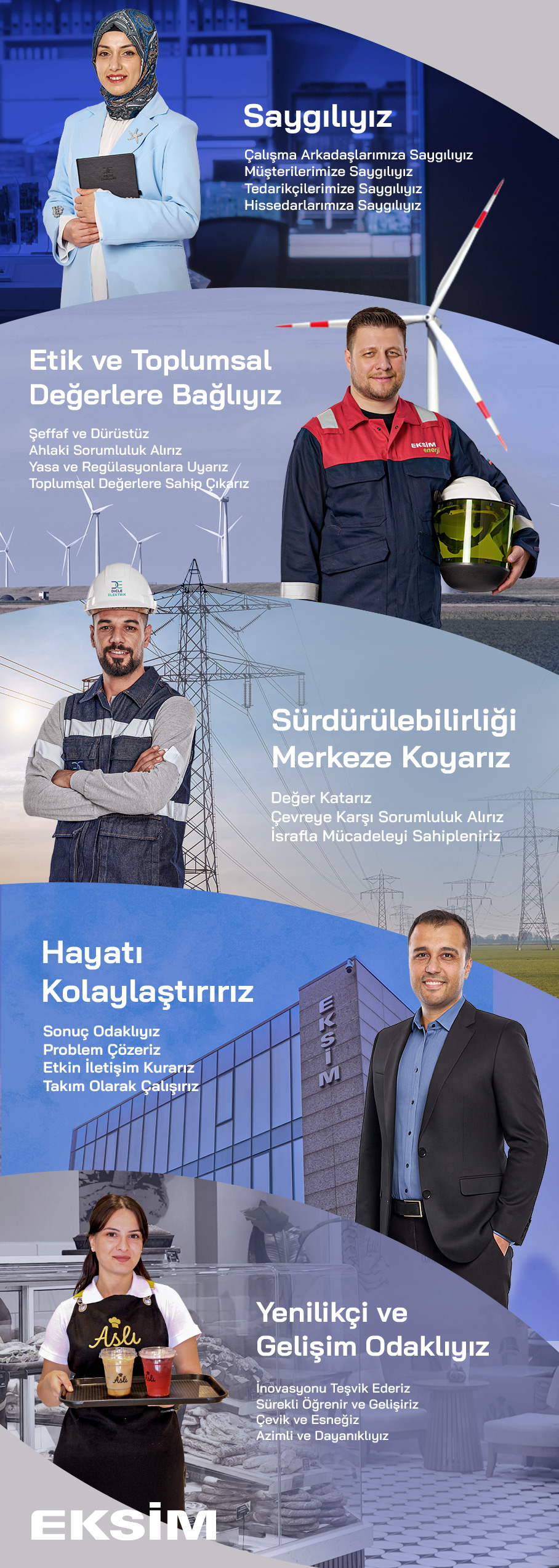 Kurulduğumuz günden bu yana benimsediğimiz değerler, iş yapış biçimimizin ve kurumsal kültürümüzün temelini oluşturmaktadır. Tüm paydaşlarımızla ilişkilerimizi karşılıklı saygı, güven ve şeffaflık üzerine inşa eder; etik ilkelere ve toplumsal değerlere bağlı kalmayı öncelikli sorumluluğumuz olarak görürüz. Yenilikçi ve gelişim odaklı yaklaşımımızla sürekli ilerlemeyi hedefler, sürdürülebilirliği tüm iş süreçlerimizin merkezine koyarız. Hayatı kolaylaştıran, çözüm odaklı ve iş birliğini teşvik eden adımlarımızla, yalnızca bugünün değil geleceğin de ihtiyaçlarını karşılayan kalıcı değerler üretiriz.